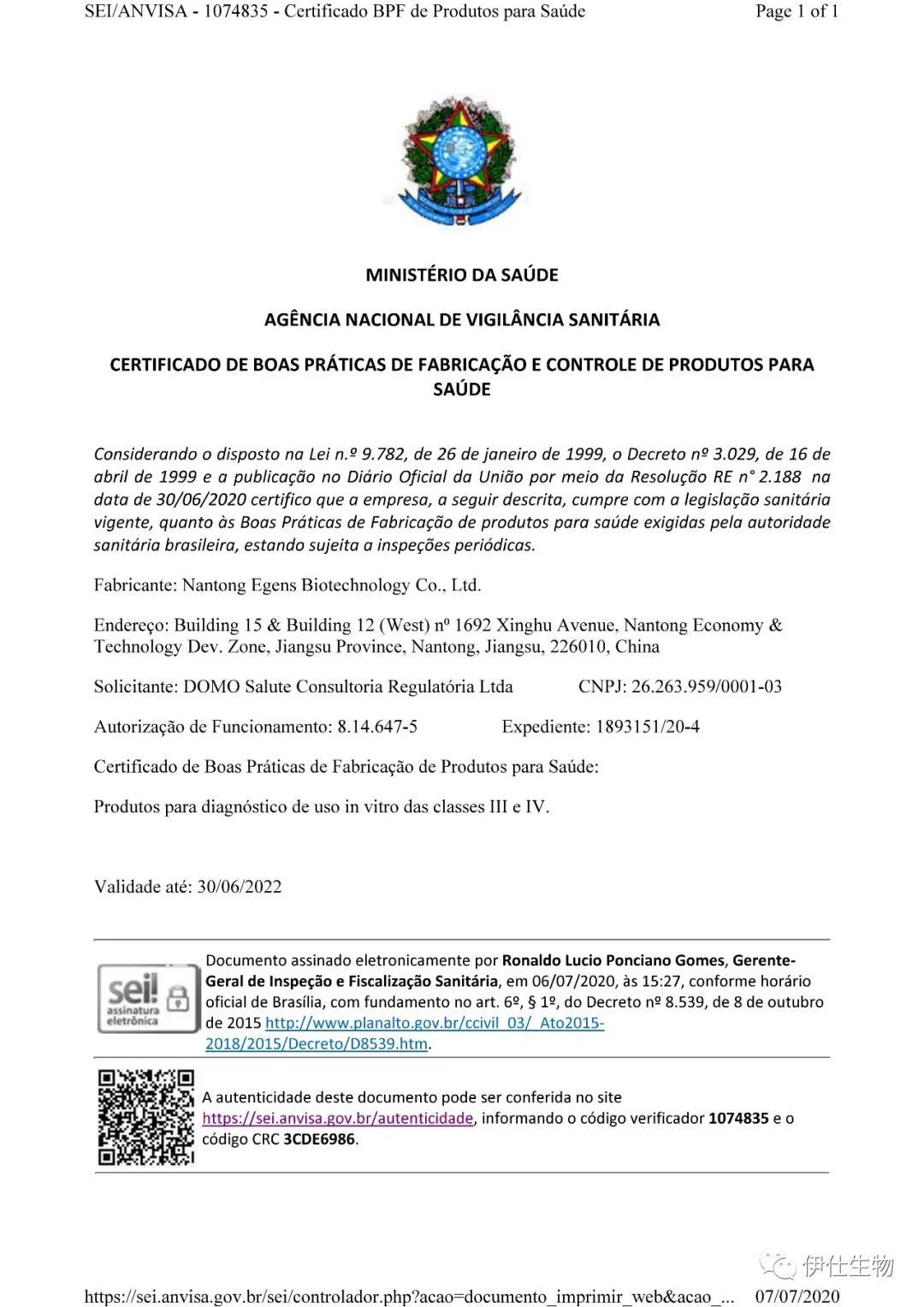 喜訊!伊仕生物新冠病毒抗原檢測試劑獲巴西醫(yī)療器械注冊證